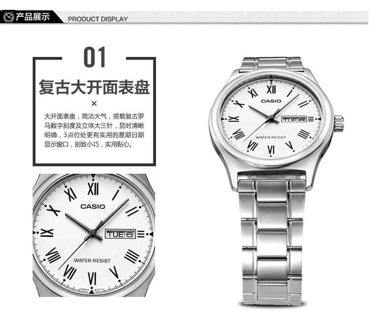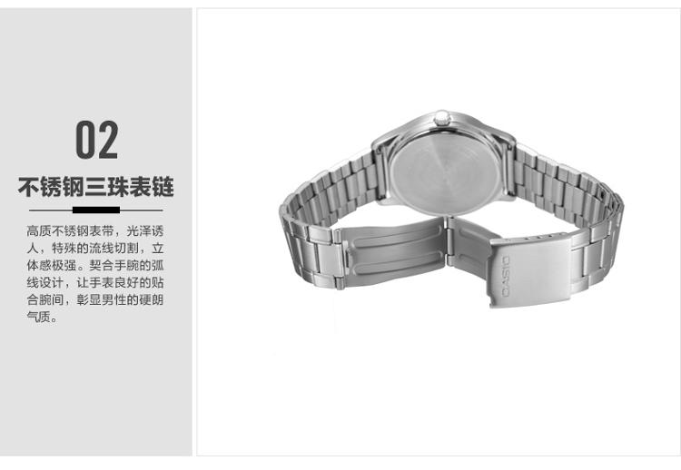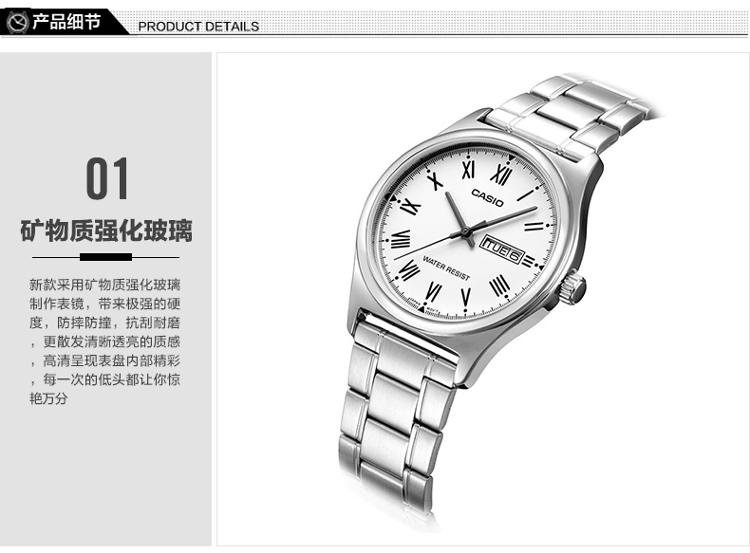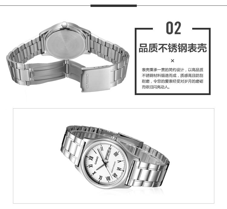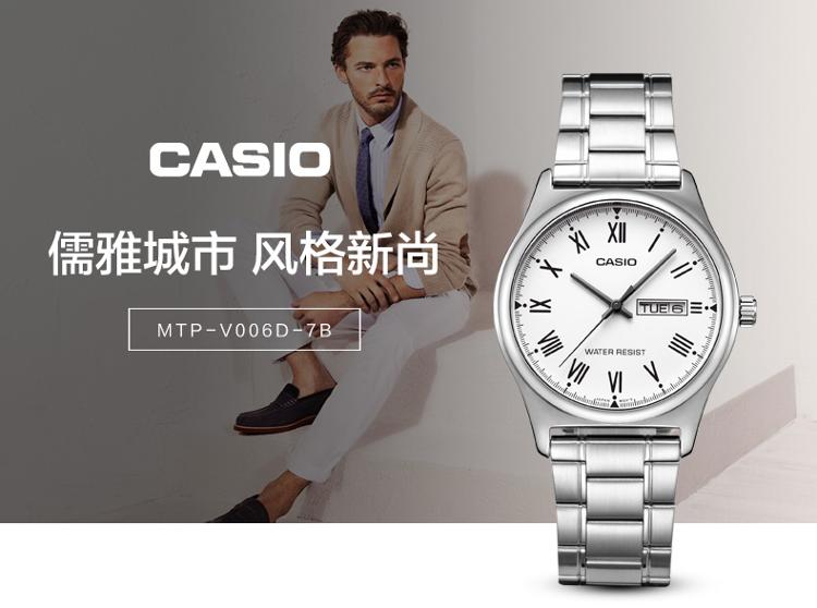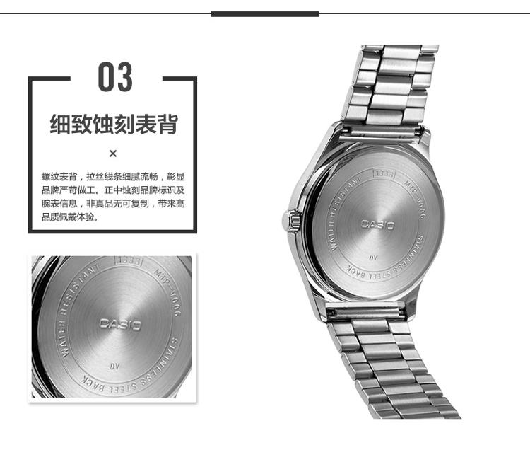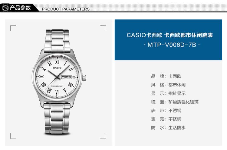 产品描述: 商品名称:卡西欧石英男表 商品编号:2914565 商品毛重:200.00g 商品产地:中国广东 货号:MTP-V006D-7B 风格:商务,休闲 防水:生活防水 表盘:圆形 表扣:折叠扣 表径:44mm以上 表壳:不锈钢 表底:不透底 机芯:石英 功能:日期显示,星期显示 适用人群:男士 表带:不锈钢