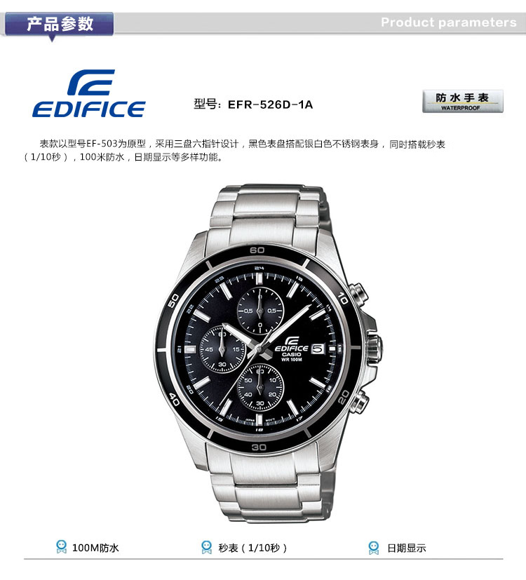 产品描述: 商品名称:卡西欧男士手表 商品编号:1198994 商品毛重:250.00g 商品产地:日本/泰国/中国等 风格:商务,休闲,时尚 防水:100米 表盘:圆形 表扣:折叠扣 表壳:其它 表底:不透底 适用人群:男士 功能:日期显示,其它 机芯:石英 表带:其它